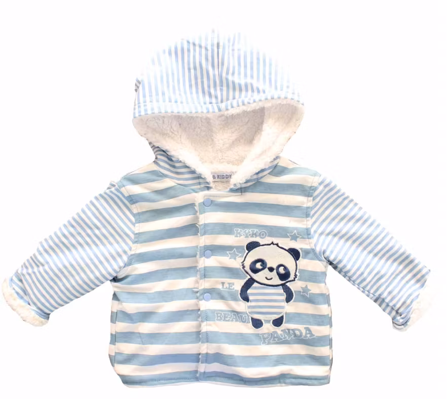 Ett sött set för barn, bestående av en jacka och ett par byxor. Jackan har ett randigt mönster i blått och vitt, med en broderad panda på framsidan och en mjuk huva. Byxorna är ljusblå med detaljer som matchar jackan.
