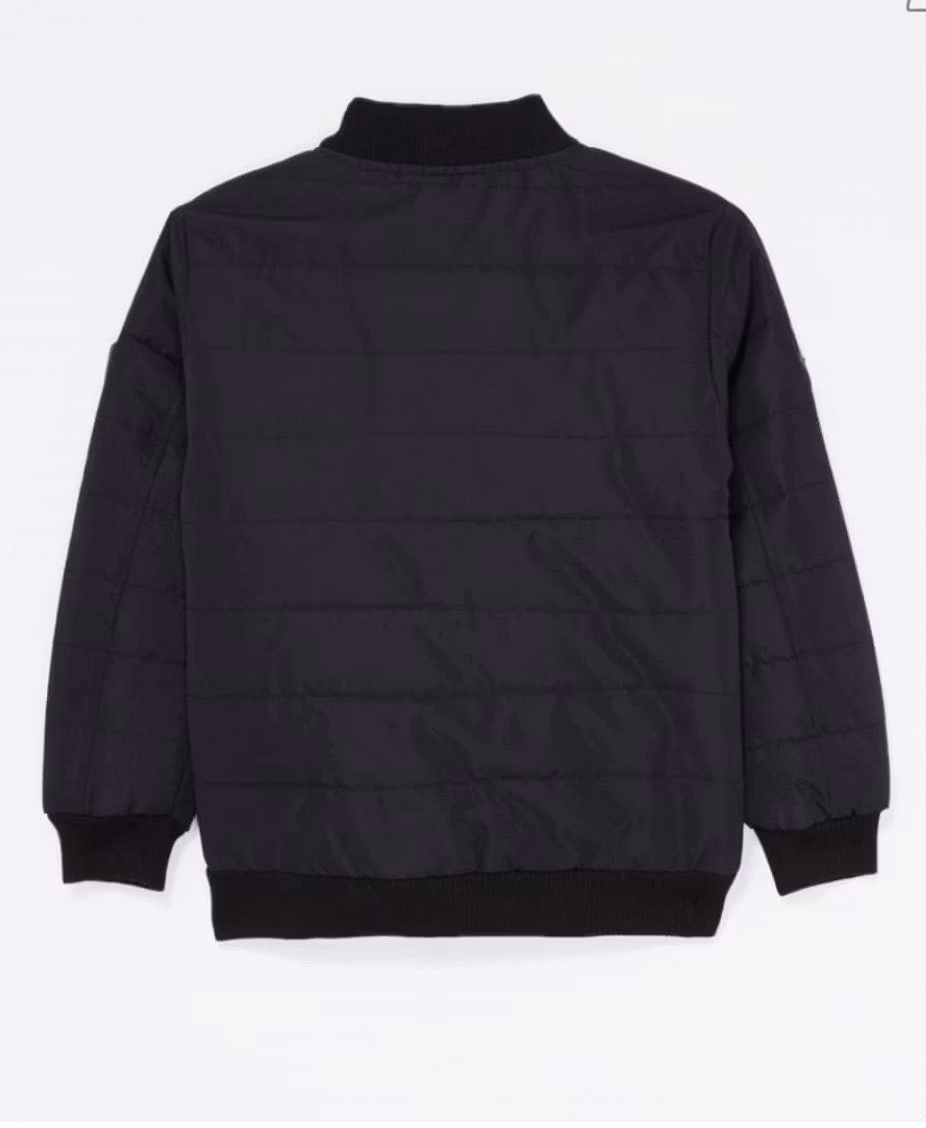 Svart vadderad bomberjacka med dragkedja framtill. Jackan har två fickor med knappstängning fram och ribbstickad mudd i halsringningen, ärmsluten och nederkanten. Det finns dekorativa märken på bröstet och ärmen.